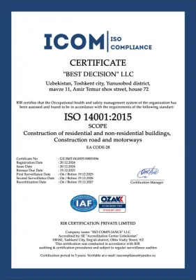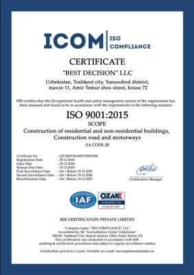 Компания «Best Decision» сертифицирована по международным стандартам ISO, что гарантирует стабильность, прозрачность и высокое качество выполняемых работ. Соблюдение международных стандартов позволяет нам обеспечивать точность, безопасность и долговечность каждого проекта.