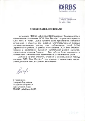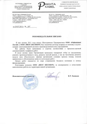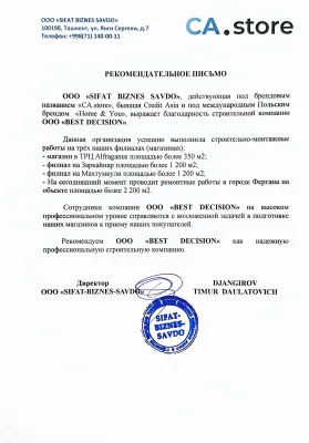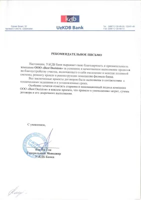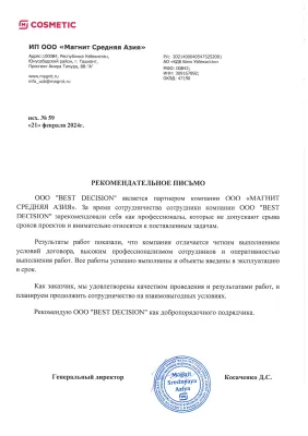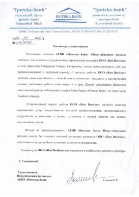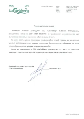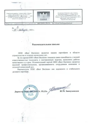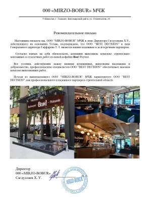 ООО «Best Decision» имеет множество рекомендательных писем и благодарностей от ведущих коммерческих компаний, а также владельцев ресторанов, кафе, фитнес-центров и офисных пространств.