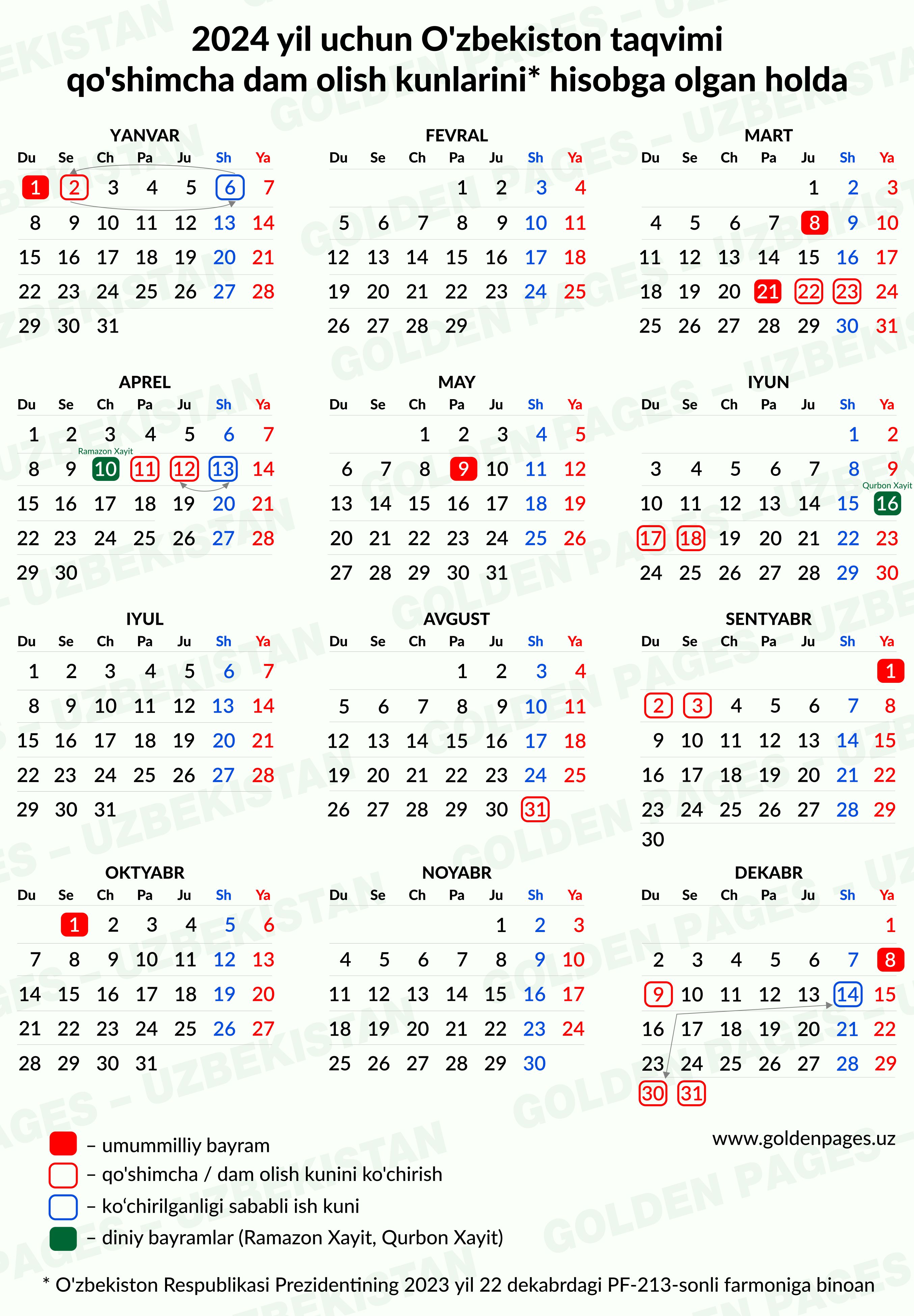 O‘zbekiston Prezidenti Shavkat Mirziyoyev 2023-yil 22-dekabrdagi "Rasmiy sanalarni nishonlash davrida qo‘shimcha ishlanmaydigan kunlarni belgilash va dam olish kunlarini 2024-yilga ko‘chirish to'g'risida"gi qarorni imzoladi. (2023 yil 22 dekabrdagi UP-213).